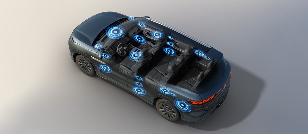 Mergulhe na excelência do sistema de áudio DiSound, que conta com 21 alto-falantes de alta fidelidade e 1500 W de potência — entregando um som impressionante, com qualidade de estúdio, para toda a cabine.